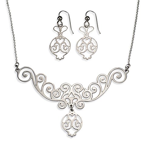 -. Binding : Jewelry -. Brand : Shira Jewelry -. Department : womens -. Feature : This majestic sterling silver necklace and earrings set offers a delightful pomegranate theme and some serious Mediterranean flair. / Pomegranates are not only beautiful, but are also symbols of abundance. / You can't go wrong when you give this set as a gift to that woman who loves eye-catching jewelry. / Made in the USA. Also available as individual items. / Measurements: pendant - 3" x 1 1/2", necklace length: 18 1/2"; earrings - 7/8" x 1/2". -. Label : Shira Jewelry -. Manufacturer : Shira Jewelry -. Model : SH-142 -. MPN : SH-142 -. PartNumber : SH-142 -. ProductGroup : Jewelry -. ProductTypeName : FASHIONOTHER -. Publisher : Shira Jewelry -. Studio : Shira Jewelry -. Title : Pomegranate Lace Jewelry Sterling Silver Set - Necklace and Earrings