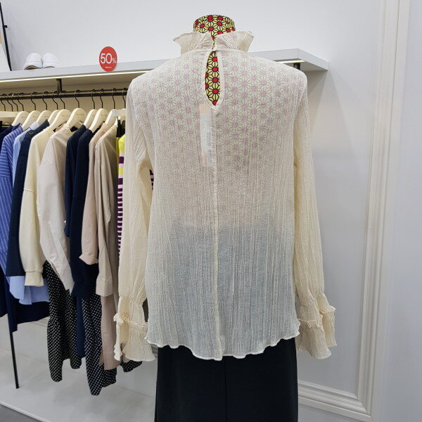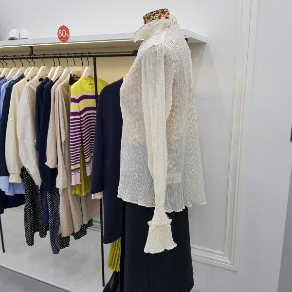 넥 과 소매끝에 보인트를 준 트렌디한 블라우스 입니다