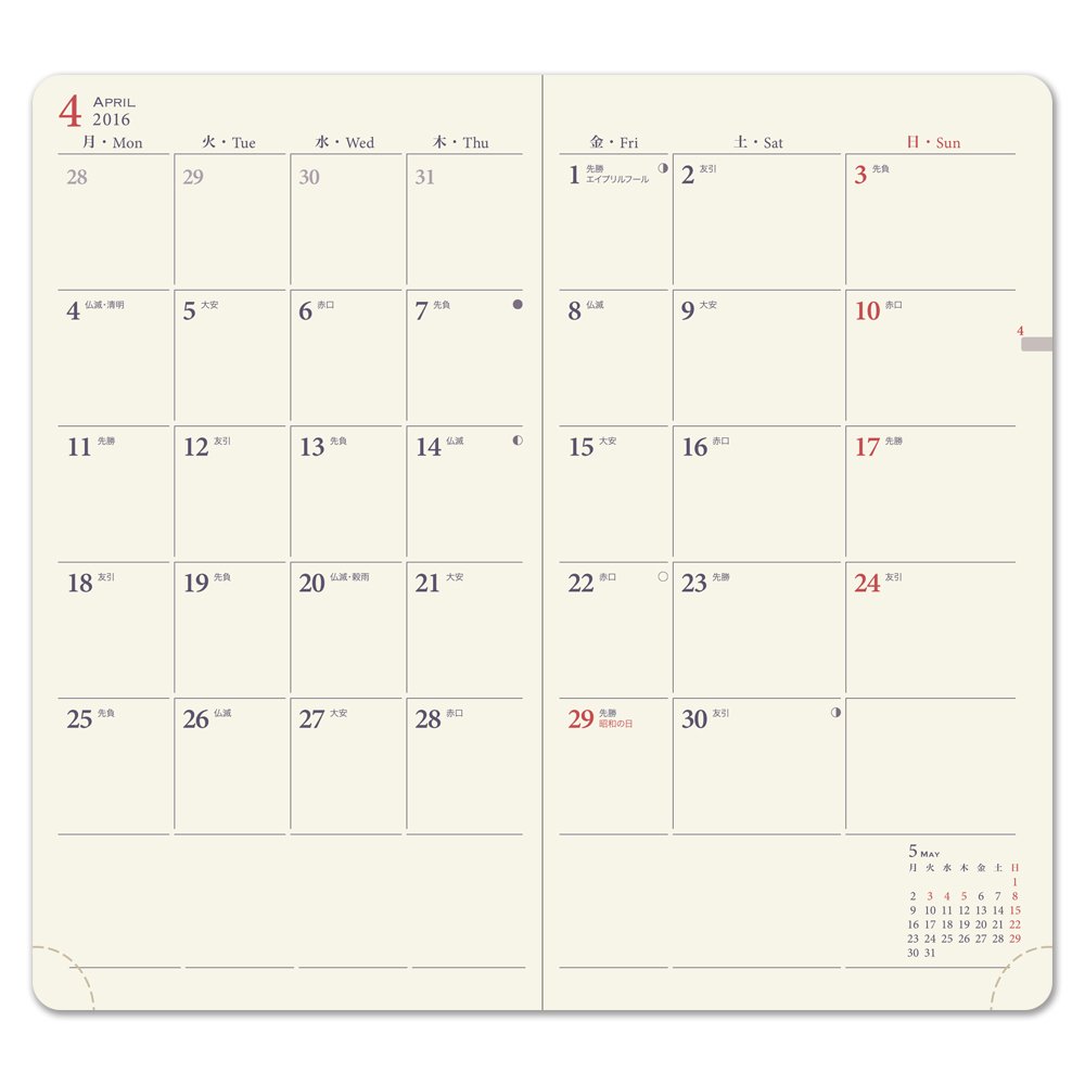 I've been using this series for nearly ten years already. I like it because it is lightweight and I can confirm the rough schedule of each month at a glance. I am useful because I can put stamps and notes in the pocket of the vinyl cover. Speaking greedy, the calendar of the following month on the lower left can be checked on the next page, so delete it and I'm happy to increase the trouble of filling in the schedule of each day accordingly. I would be more pleased if you create a series that is just as large as the size, just like design and number of pages. Saying that I like it, Sumi satsen after all finding a kettle or order.