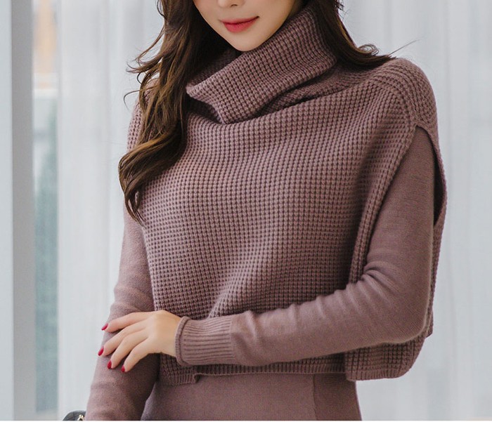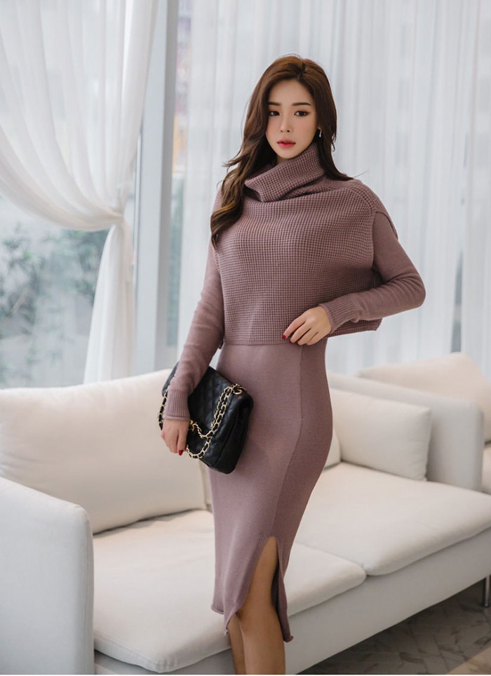 商品名:ワンピース トップス セット ニット タートルネック 無地 膝丈