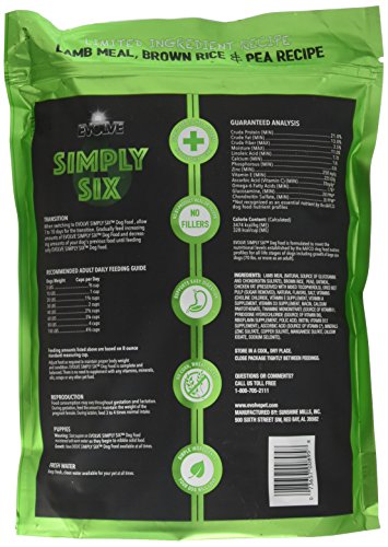-. Feature : 4lb size. Evolve Simply Six, Limited Ingredient Recipe / No Corn, Wheat, or Soy / No By-Product Meal or Fillers / Formulated To Help Support Healthy Skin & Coat