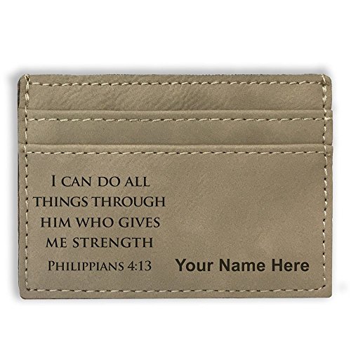 -. Binding : Apparel -. Brand : SkunkWerkz -. ClothingSize : Medium -. Color : Light Brown -. Department : mens -. EAN : 0654975837026 -. Feature : The Money Clip Wallet is laser engraved with the image that you see in the photo. / Your name or personalized message will be engraved on the wallet for free. / Synthetic leather construction. Includes space for 3 credit cards. / You may have one line of engraved text - 20 characters maximum. / Click the "Customize Now" button to begin customizing your wallet. -. ProductGroup : Apparel -. ProductTypeName : ACCESSORY -. Size : Medium -. Title : Money Clip Wallet - Bible Verse Philippians 4:13 - Personalized Engraving Included (Light Brown) -. UPC : 654975837026