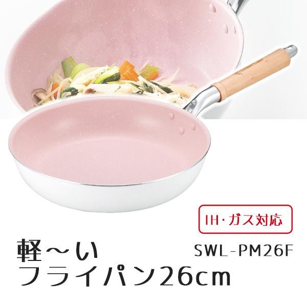 こびりつきにくく、お手入れも簡単で使いやすいです。 製造国:中国 素材・材質:本体:アルミニウム合金(内面:フッ素樹脂加工、外面:焼付塗装)底面:ステンレス鋼取っ手:天然木 商品サイズ:約48×27.5×11cm 重量:550g 仕様:対応熱源:IH(100V、200V)・ガスコンロ食洗機・乾燥機使用不可 ※サプライヤー直送品 ご注文後2~3営業日後の出荷となります【商品名】Sweet Leaf(スイートリーフ) 軽~いフライパン26cm SWL-PM26F 1155-028