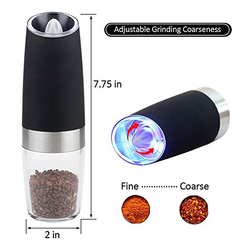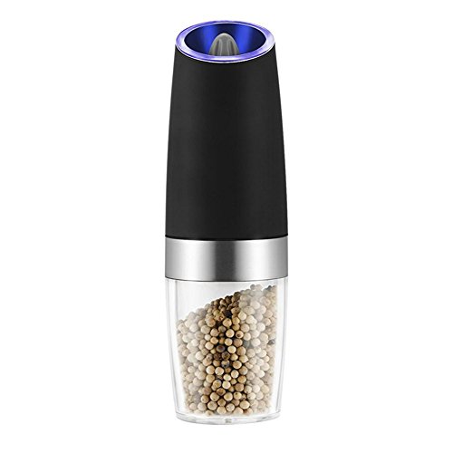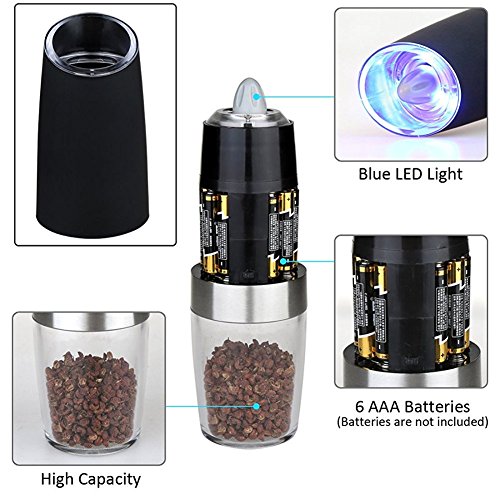 Blue LED Light: Features a BLUE LED light that turns on automatically when the grinder is in operation. Battery Powered,no buttons to press or manual grinding.One handed operation,simply tilt to automatically activate the spice grinder.Return to vertical to stop. Requires 6 AAA Batteries. (Batteries is not included)