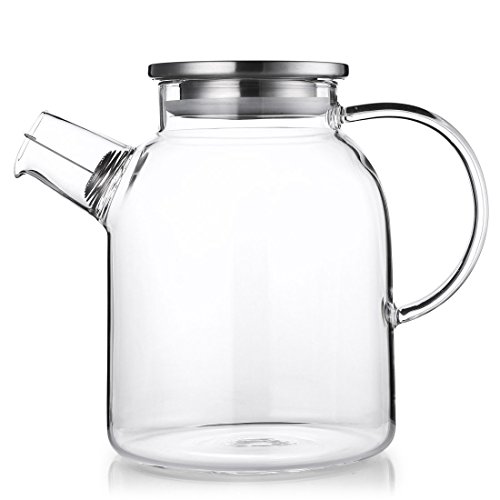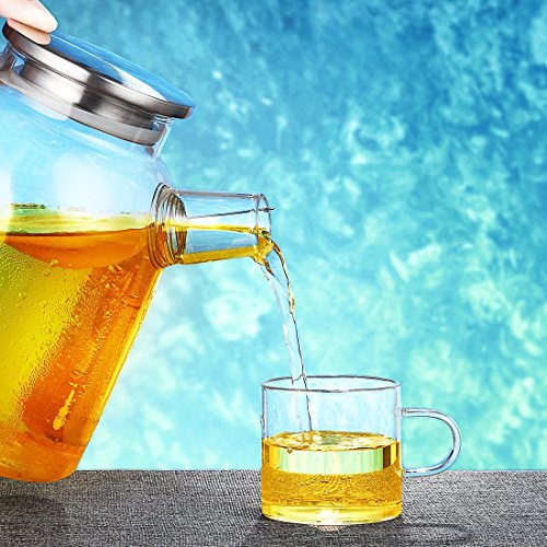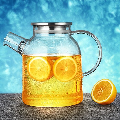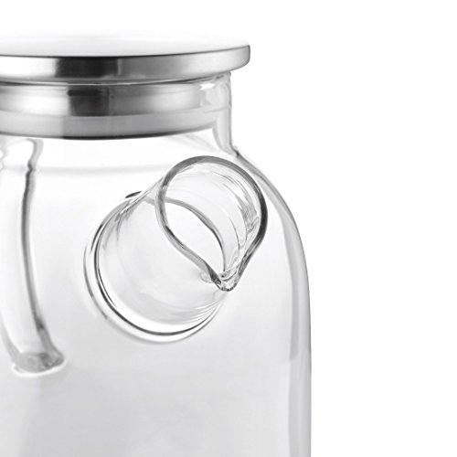 Feature ? The pitcher is made of borosilicate glass with lid made of stainless steel. ? The pitcher can be used for many types of beverages from water, iced tea and fruit infused juices and so on. ? Made of heat resistant, lead-free lab grade borosilicate glass, no metal or plastic parts. ? Dishwasher,microwave,Refrigerator safe. ? The carafe mouth is large enough for ice cubes and sliced lemon.