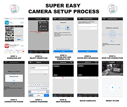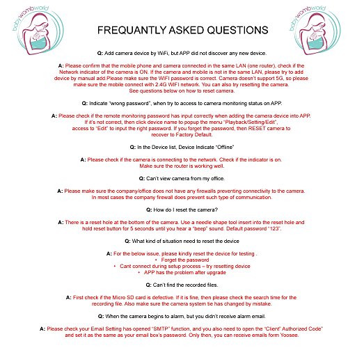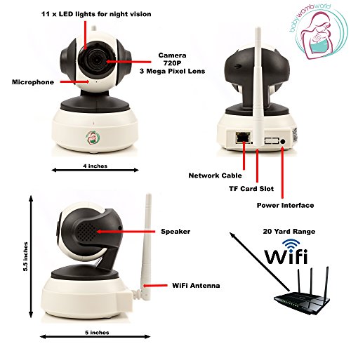 -. Feature : STAY IN TOUCH WHEREVER YOU ARE - Are you worried leaving your baby or child alone? Using our iphone, android, windows device, tablet or PC you can now keep an eye on your little one wherever you are all the time! No more need to stress or worried as a parent. Whether you are at work, gym, shopping or just in another room in the house, you can watch, listen and talk to your baby via the WiFi connection to your nanny cam. / FANTASTIC FEATURES - The 720P high resolution lens provide crystal clear images and video recordings (TF card not included) at day and night. Eleven infrared sensors around the camera lens allows recording of video in a complete dark room with as low illumination as 0.1 Lux. Alarm push motion detection will notify you when there is any movement and via the smartphone you can remotely pan (355 degrees, horizontal) and tilt (90 degrees, vertical) the camera to view everything in the room. / SUPER EASY TO CONNECT AND USE - Step 1: Download the app by scanning the QR code on the packaging. Step 2: Make sure the WiFi camera has power and your WiFi network is on. (Note: Camera does not work with 5G) Step: 3 Using the "smartlink" on the app, pair the camera to the smartphone. Step 4: With the camera in close proximity (max 20 yards) from WiFi router it is ready for use. / WHAT ELSE - Included is a mounting bracket for those who want to fix the camera to a wall. This camera can also be used to remotely look after your pet, the elderly or to just have an eye on your home while you are away from home for security purposes. All BabyWombWorld cameras are CE and FCC certified and we guarantee superior after sale customer service. / MONEY BACK GUARANTEE - All our BabyWombWorld cameras are backed by our 60 day no questions asked, absolutely no-hassle money back guarantee. We believe that our premium product is the best we can offer to our customers, so we back our brand with this guarantee. If for any reason at all, you are not fully satisfied with your BabyWombWorld monitor, just simply return it for a full refund.