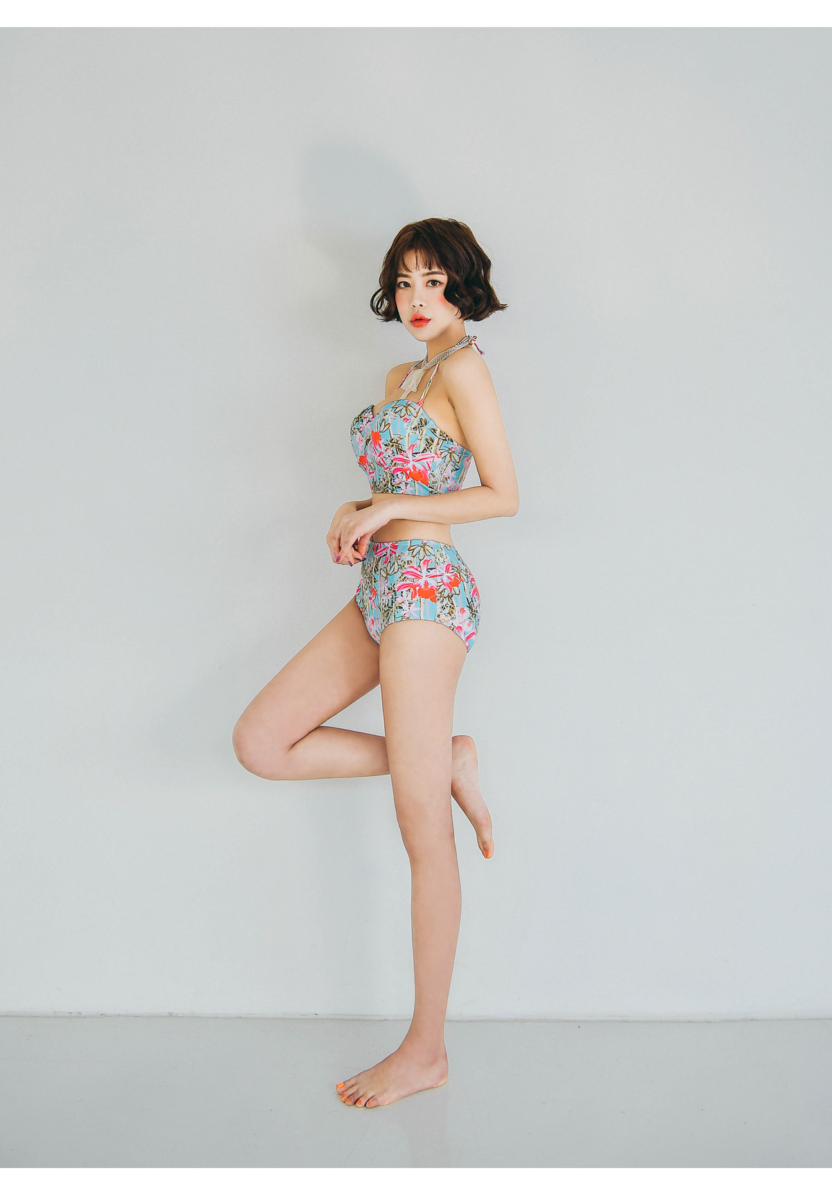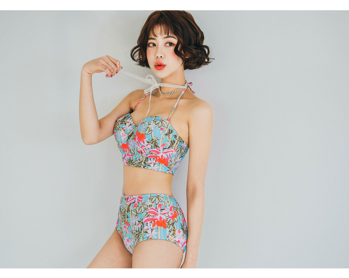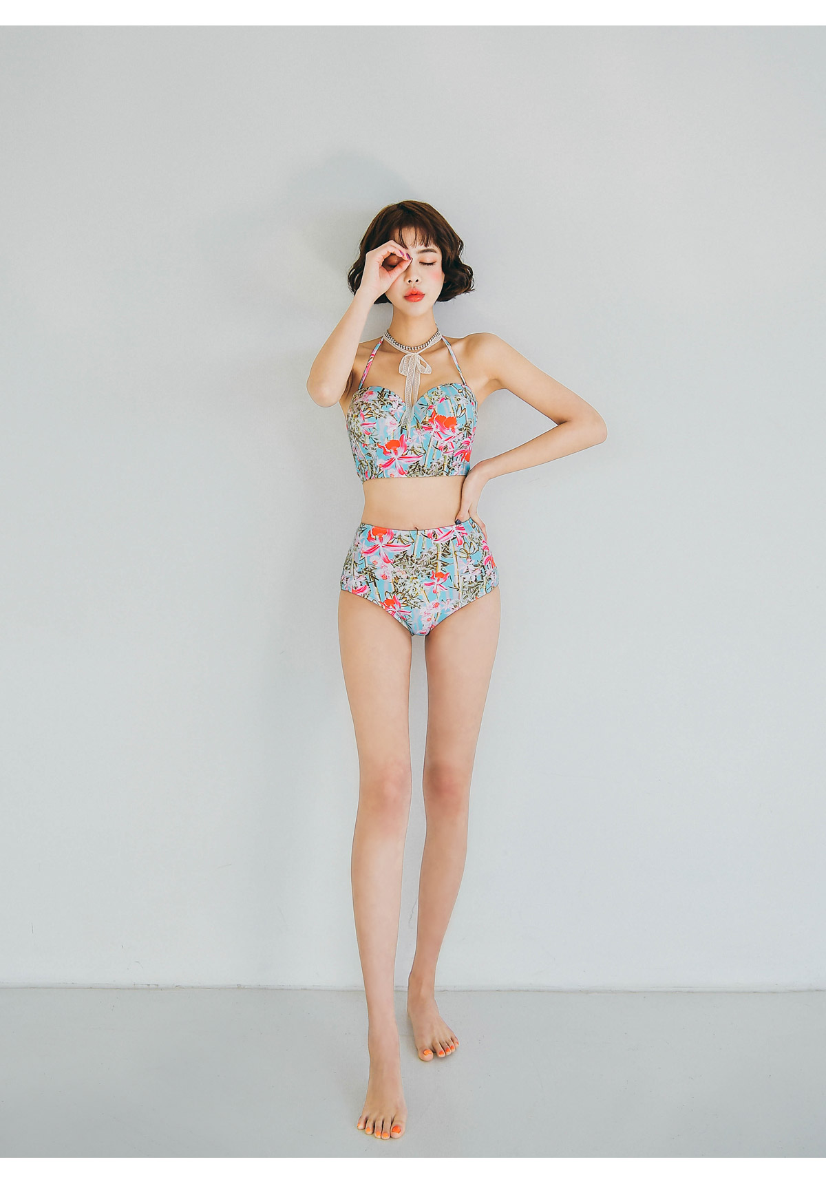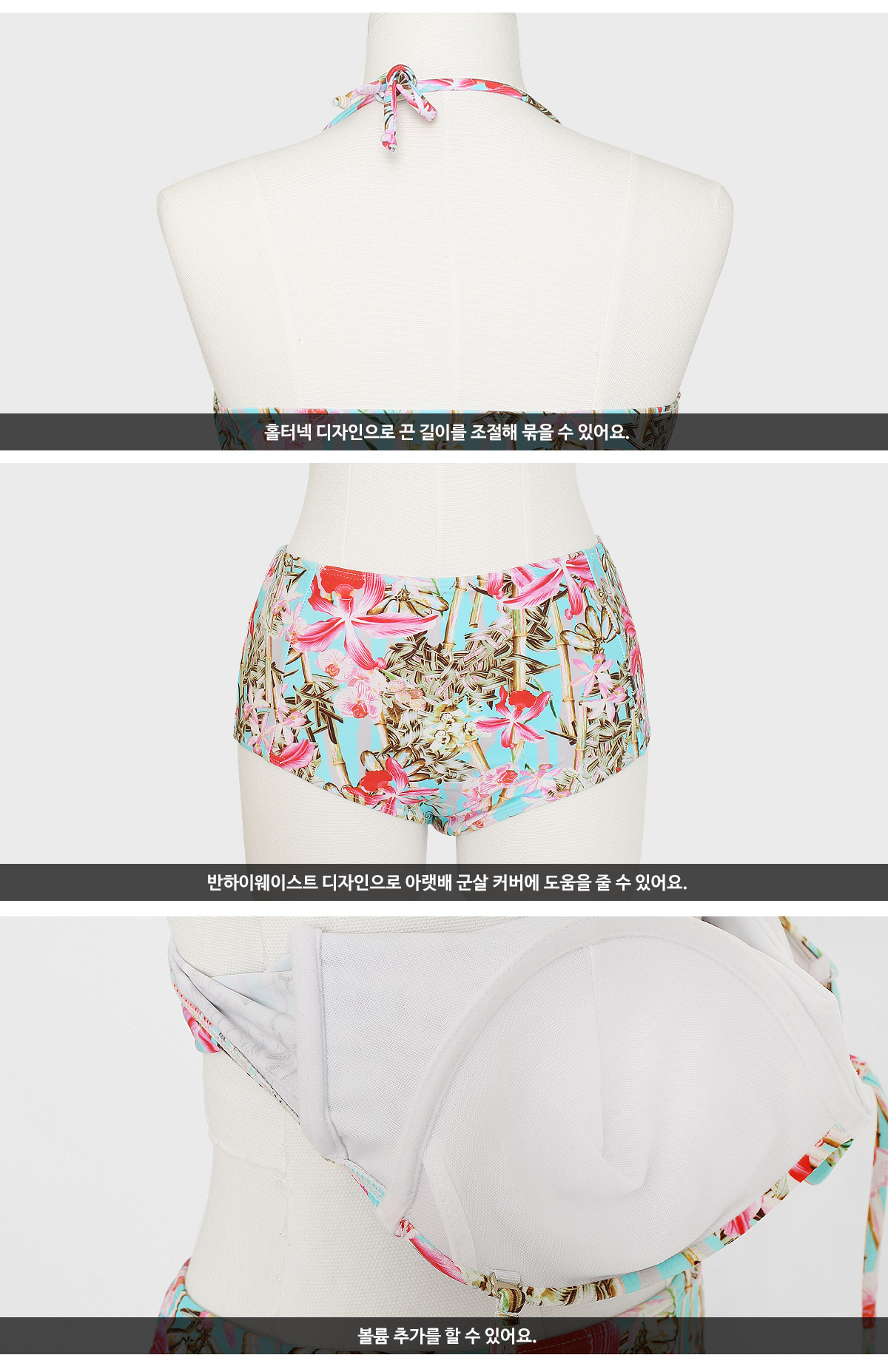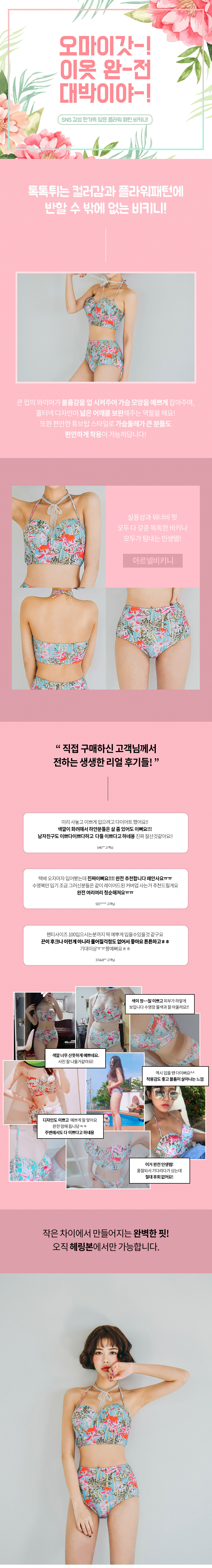 민트 바탕에 핑크계열 플라워 트로피칼 패턴이 화사하고 시원해 보이는 비키니예요.