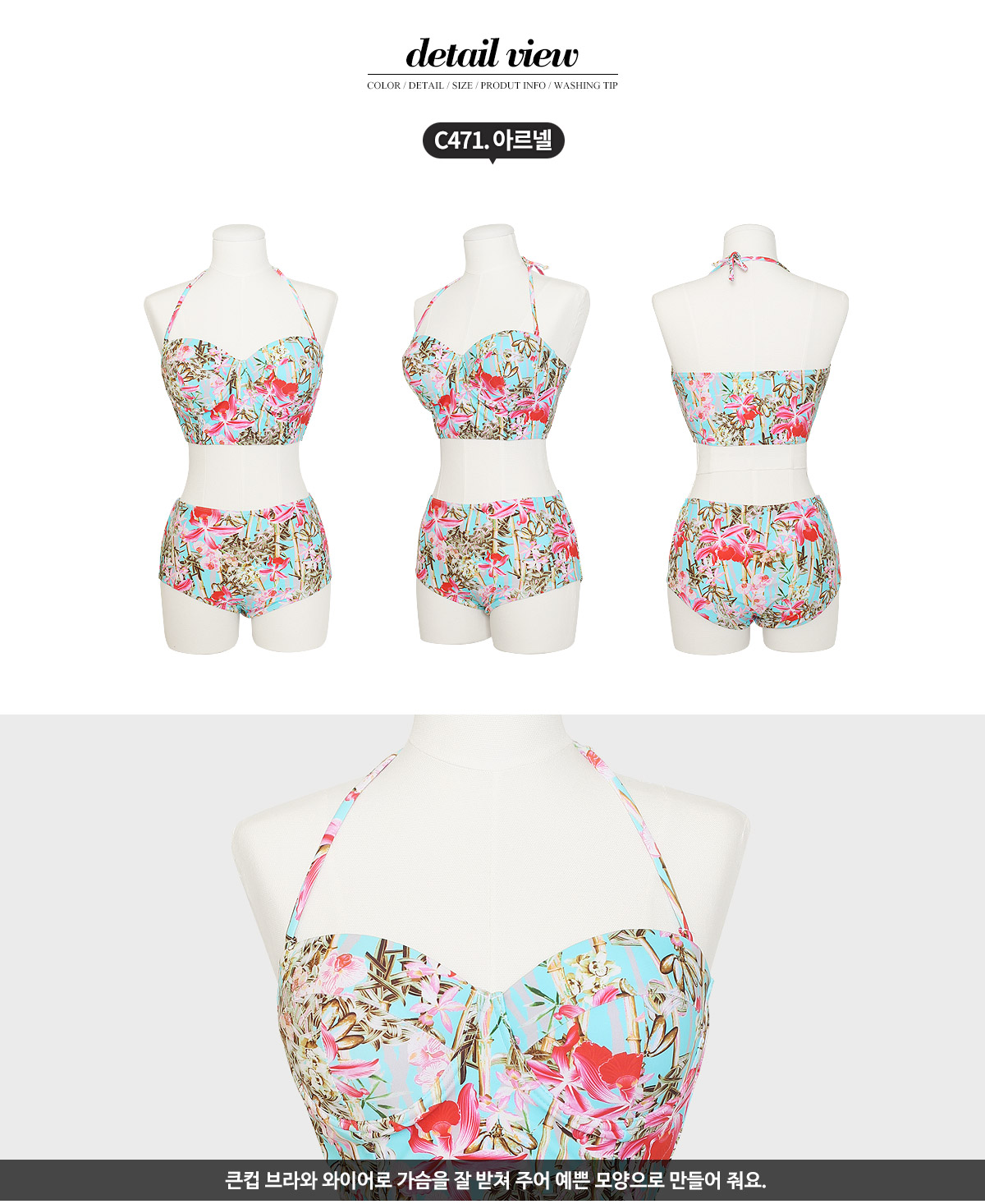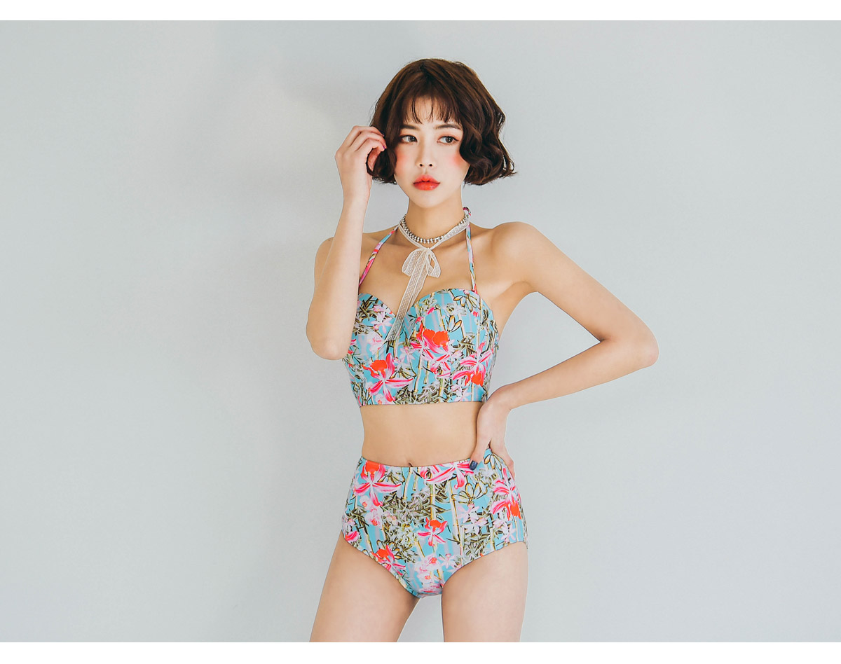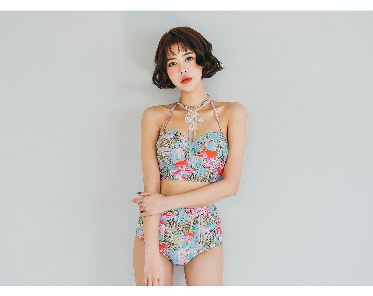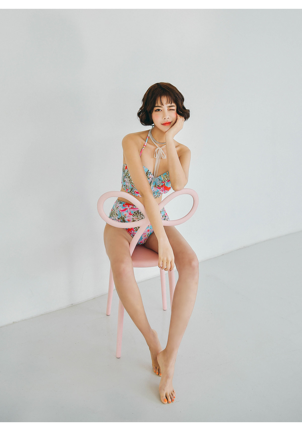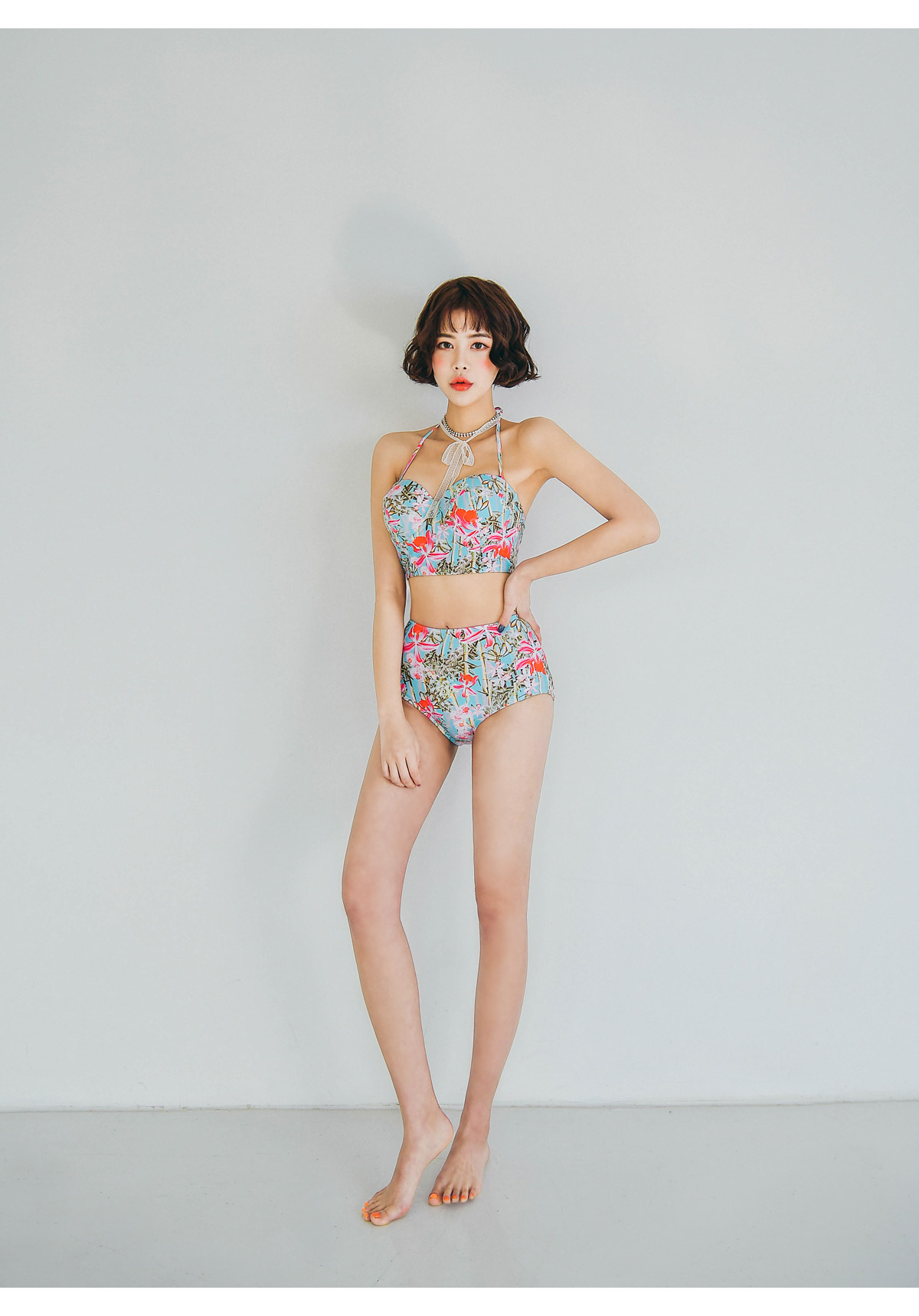 민트 바탕에 핑크계열 플라워 트로피칼 패턴이 화사하고 시원해 보이는 비키니예요.