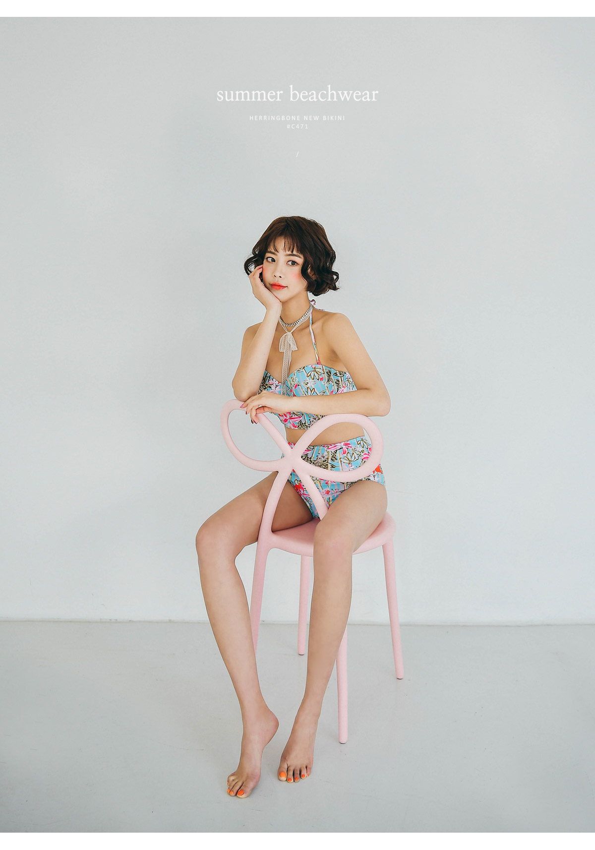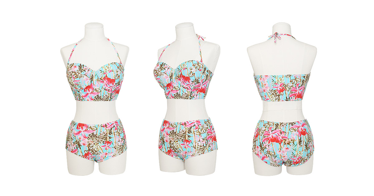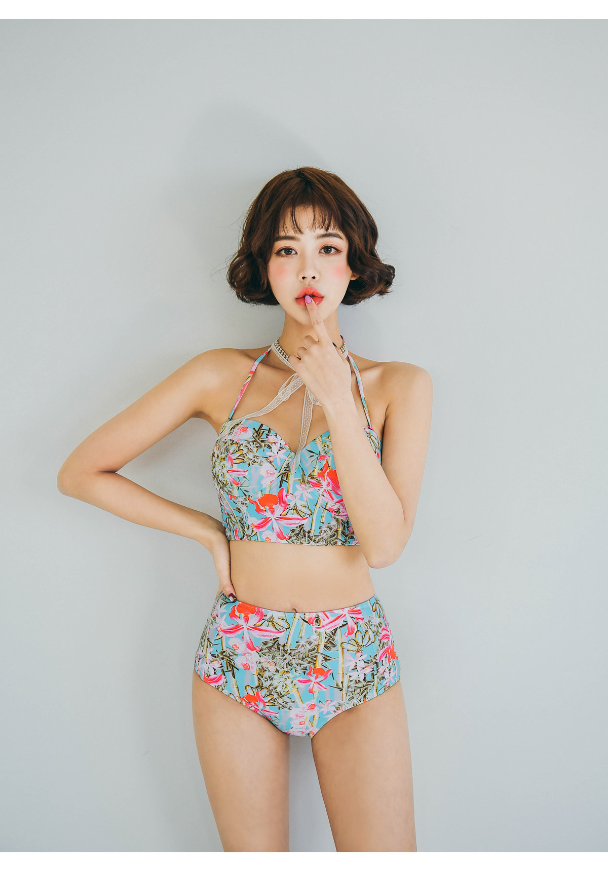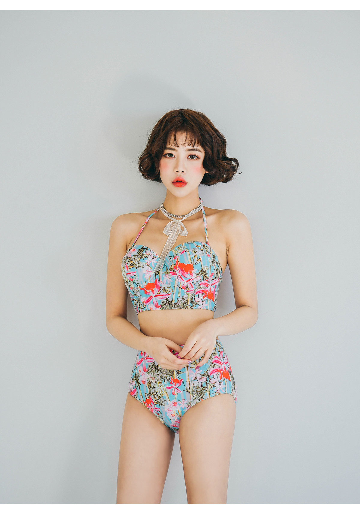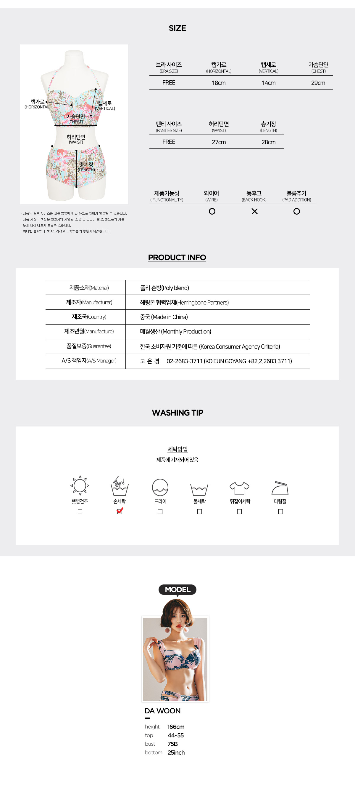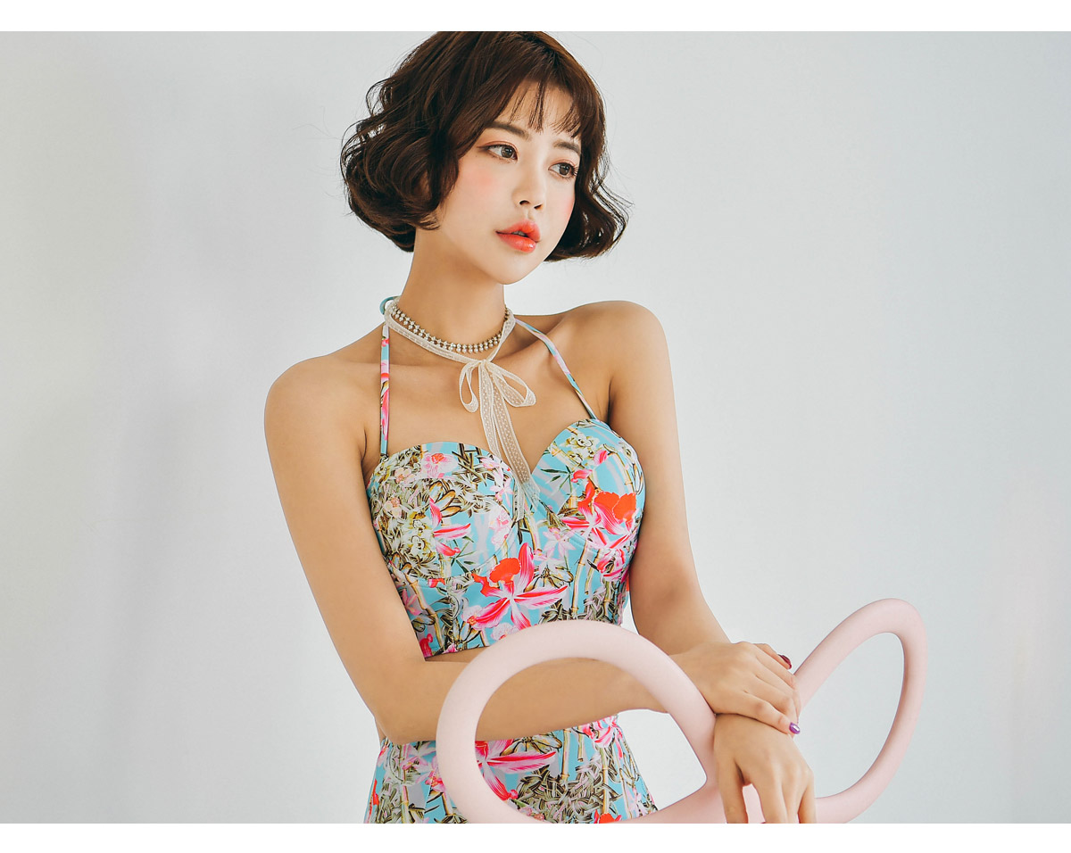 민트 바탕에 핑크계열 플라워 트로피칼 패턴이 화사하고 시원해 보이는 비키니예요.