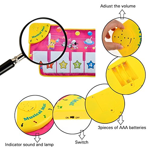 -. Feature : Big Size Baby Favorites Musical Toys can touch and step on. Music Sound Reward Baby's Natural Kicking and Touching.Children can go to touch, also can use feet to kick up. Learn the baby can fondle admiringly certainly. / Eight piano function keys, 6 kinds of animal sounds and pronunciation / Press tightly or step disfferent button, one side send out different kinds of sound or music, one side shining / From just a few months old babies start expressing themselves by kicking. / Adopting intelligent electronic chips, it will be to enter a state of energy saving automatically after idle 2 minutes
