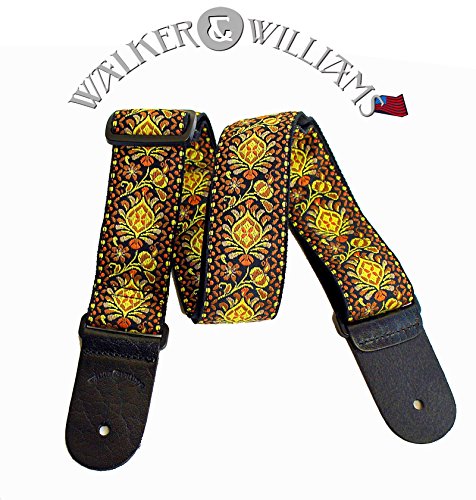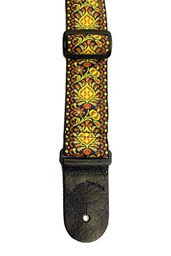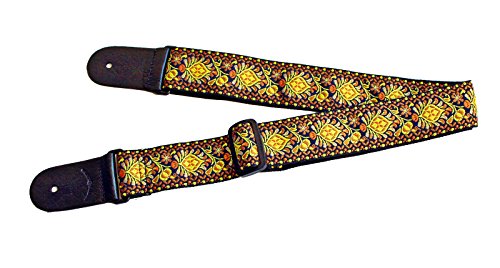 -. Feature : Hand Sewn Guitar or Bass Strap 2" Wide, adjustable from 32"-55" / Jacquard woven Woodstock design / High quality webbing backing material / Thick leather end caps / Non-scratching poly adjusters