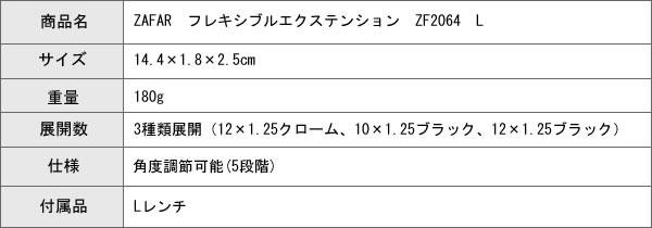 従来品とは異なり、バーの途中で角度を調整できる優れもの。最大60度まで15度ずつ5段階調整できます。 製造国:台湾 素材・材質:スチール 商品サイズ:14.4×1.8×2.5cm 重量:180g 仕様:角度調節可能(5段階) 付属品:Lレンチ ※サプライヤー直送品  ご注文後2~3営業日後の出荷となります【商品名】ZAFAR フレキシブルエクステンション ZF2064 L 12×1.25クローム