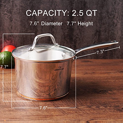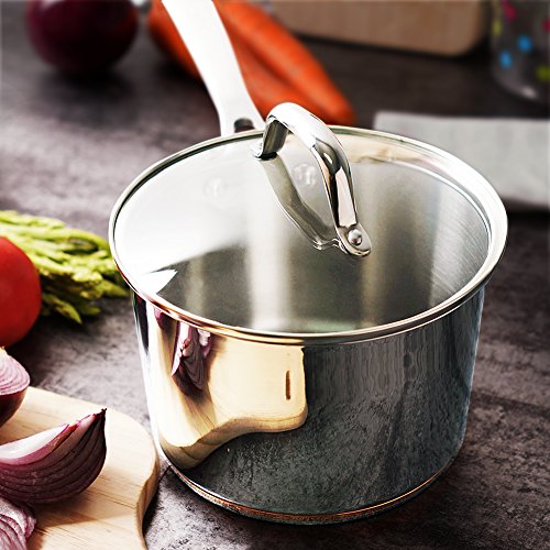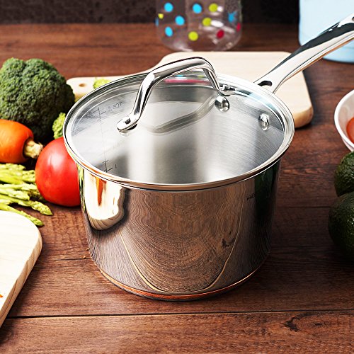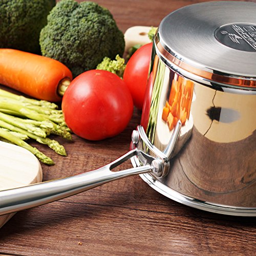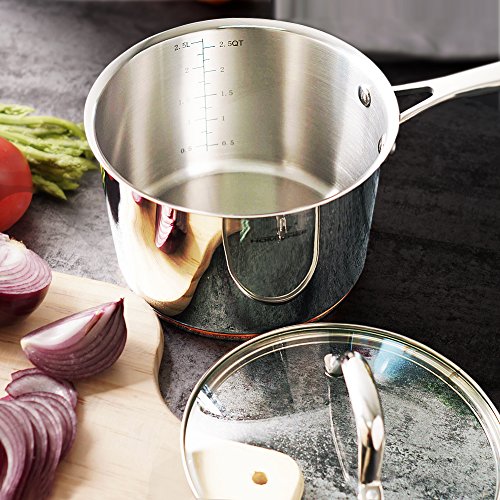 1. A ring of copper adds an elegant and noble touch to the mirror-polished 2.5 QT sauce pan. 2. Matte polished cooking surface with a starburst finish provides easy maintenance. 3. Great for cooking vegetables, melting butter, simmering sauces, soups or gravies.
