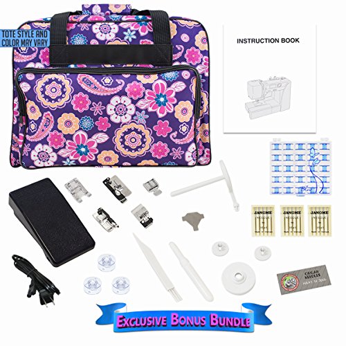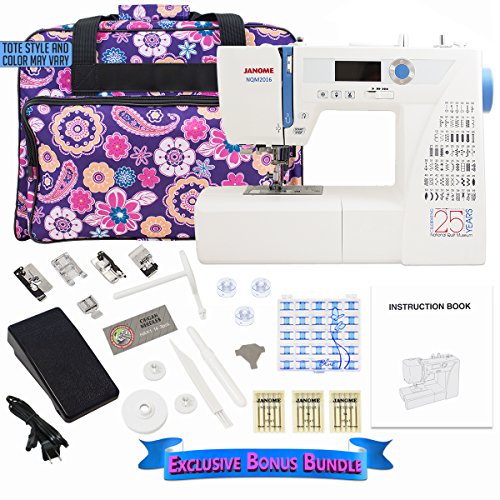 -. Feature : Bonus Bundle includes: Janome Bobbins Blue 25 Pack w/ Case, 3 Packs Janome Universal Needles (Size 14) and a Janome Sewing Machine Tote bag in Purple Pattern. / National Quilt Museum 25th Anniversary machine is a limited edition 2016 model that features the stability and dependability you expect only from a high-end machine / 60 built-in stitches, including 6 one-step buttonholes that give you essential variety for your diverse sewing needs / Utilize an automatic thread cutter, start/stop button, locking stitch button, memorized needle up/down and speed control slider / LED screen with easy navigation buttons makes finding stitches a breeze