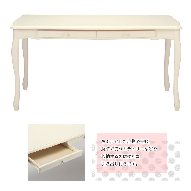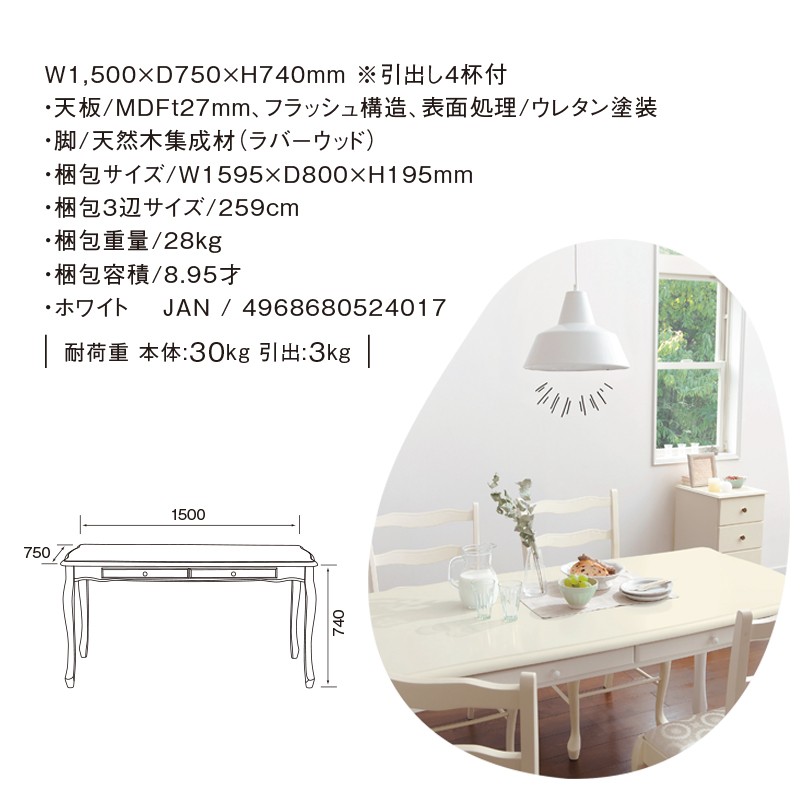 ●W1500×D750×H740mm ※引出し4杯付●天板/MDFt27mm、フラッシュ構造、表面処理/ウレタン塗装●脚/天然木集成材(ラバーウッド)●梱包サイズ/W1595×D800×H195mm●梱包3辺サイズ/259cm●梱包重量/28kg●梱包容積/8.95才●ホワイト●耐荷重 本体:30kg 引出:3kg●JANコード:4968680524017◆注意事項◆白家具は長期間直射日光に当て過ぎると白が少しずつ黄変する恐れがありますので、高温多湿,直射日光を避けてご使用下さい。【こちらの商品はメーカー直送品です】※代引きでのお支払い不可※ご指定日受付不可とさせて頂きます。※在庫ありの場合は5日ほどで発送になります※在庫切れの場合いご連絡させていただきます。※同シリーズ以外の商品との同梱はできません。ご了承ください北海道、九州への発送は別途500円加算になりますご了承ください