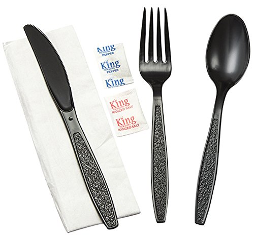 WNA 611968 6-Piece Cutlery Kit, 15" x 13-1/2" 1-Ply Napkin, Heavy Black Styrene Knife-Fork-Spoon (Case of 250)