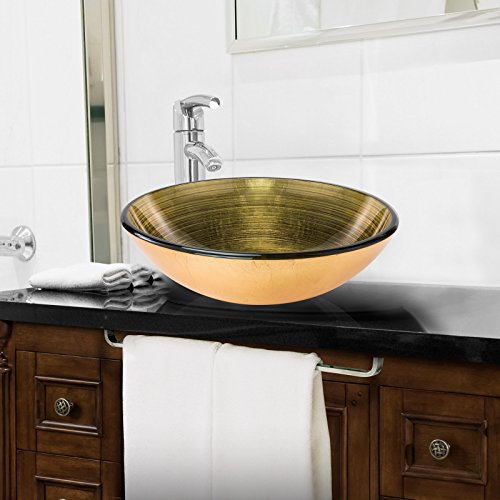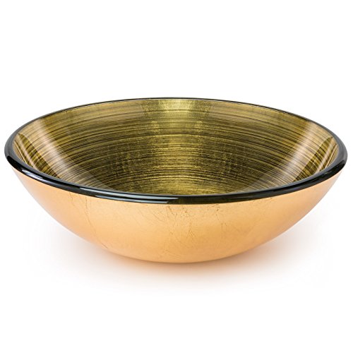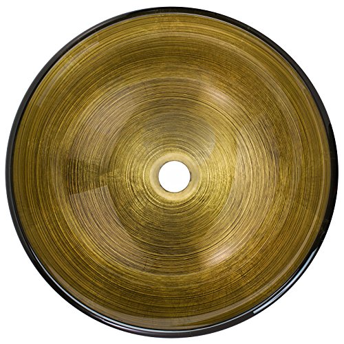 Premium Tempered Glass Vessel Sink; Round Shaped Bowl, Gold Foil Leaf Color, 1/2 in. Thick