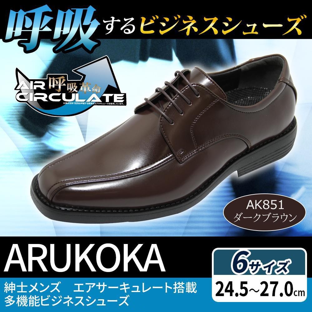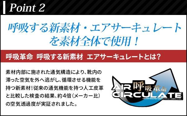 | 素材内部に施された通気構造により、靴内に滞った空気を外へ逃がし循環させる機能を持った新素材・エアサーキュレートを使用したビジネスシューズ。ムレにくく疲れにくい設計にするため、通気孔付きの靴底や衝撃吸収クッションを搭載!! |