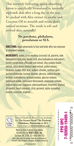 Your sun-kissed skin will feel revived with hydrating Burt's Bees Aloe & Coconut Oil After Sun Soother. It's specially formulated to replenish and re-condition skin after sun exposure. This quick-absorbing face and body lotion is packed with natural aloe vera extract soothe and coconut oil to hydrate and retain skin's natural moisture. Keep your skin soft and healthy, naturally with this soothing after sun moisturizer.Feature