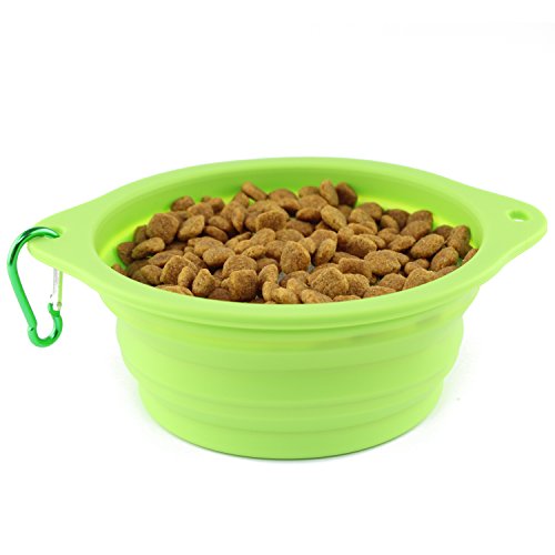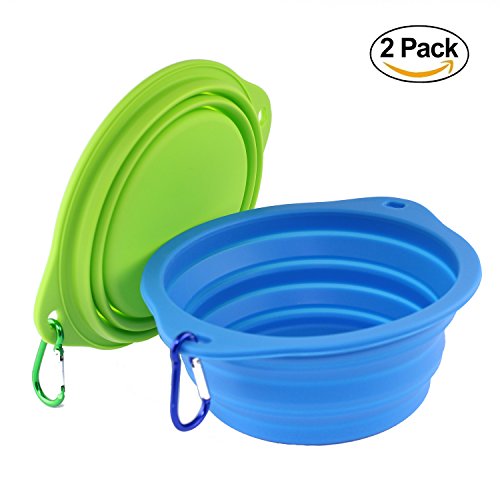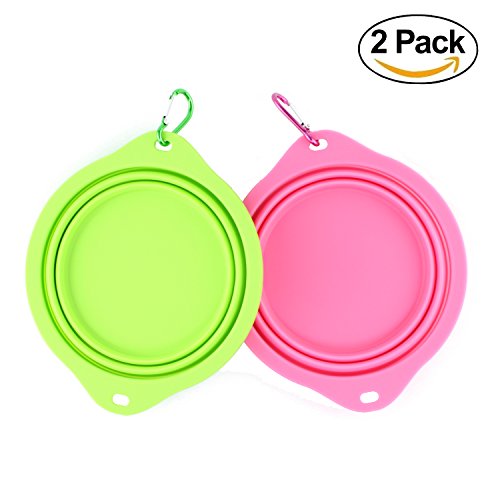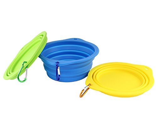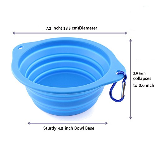 -. Feature : SAFE and ENVIRONMENTAL FRIENDLY material: qualified silicone, non-toxic, tasteless, withstand high temperature, FDA approved / CONVENIENT, FOLDABLE and PORTABLE: collapsible means space saved and made it easier to travel, drive and camping , smoothy inner material, easy to rinse, wash and clean, attach to dog waste bags dispenser easily / DURABLE, FLAT and COMPACT: Leak Proof, LARGE collapsible bowls are easy to store and transport, fantastic when you have large size pets, perfect for keeping in a car, boat or RV where space might be at a premium / MORE REASONABLE P.R.ICE while keep same function and quality, also make shopping more convenient / DIMENSIONS: top diameter 7.2", bottom diameter4.3", inner height 2.6", eash bowl holds up 3.4 Cups (27 oz.) food or water, each pack comes with 2(or 3) bowls and 2 (or 3) carabiners