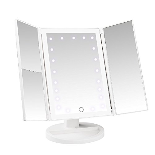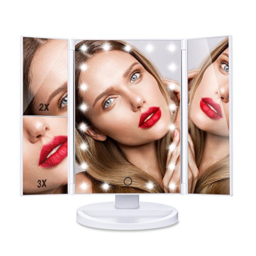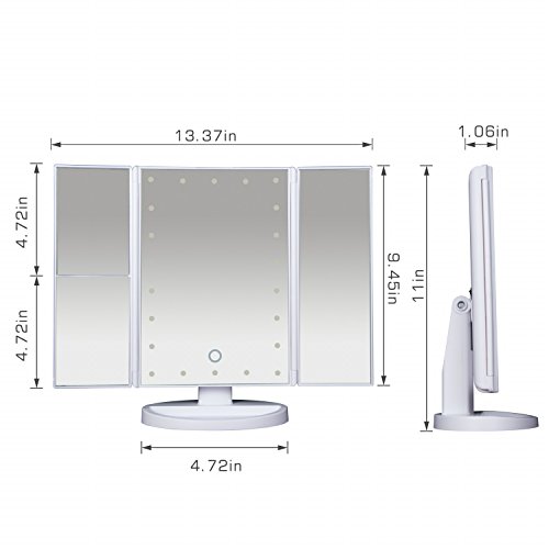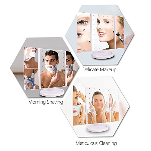 - Stunning Tri-Fold Design: 3 panels provides you wide-angle viewing, helps you make a more exquisite makeup from different angles. This makeup mirror is foldable, it ensures the safety of the mirror when you put it into bag or suitcase when you travel.