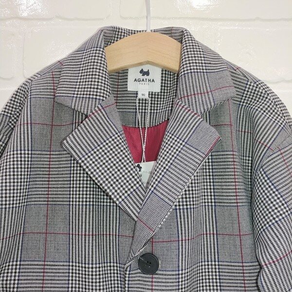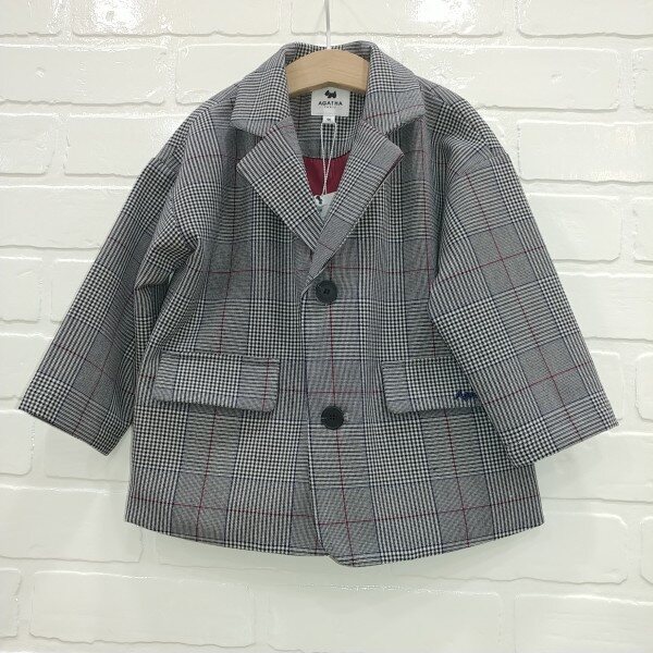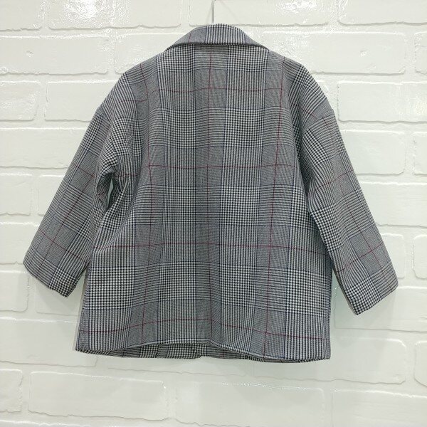 박시핏의 글렌체크 자켓으로 주머니 후다에 로고 자수가 포인트로 들어가는 스타일입니다.