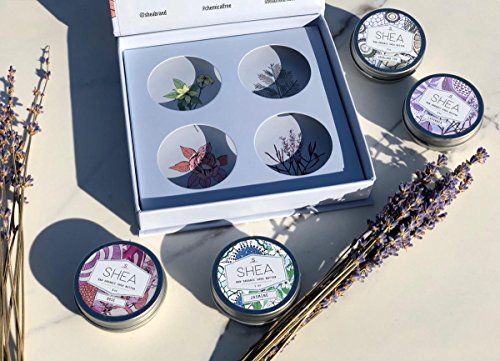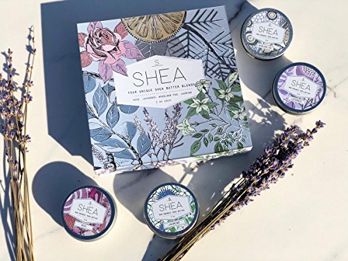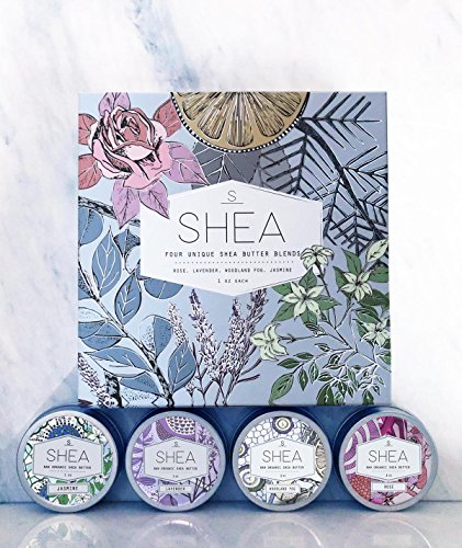 - Contains four shea butter blends made with pure essential oils and Certified Organic shea butter (Jasmine, Lavender, Rose and Woodland Fog)