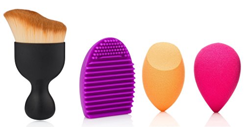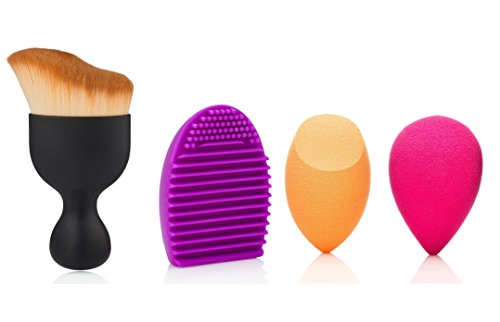 This Cosmetic set includes 4 in 1 items: 1 Tailored S-Shaped Curved Foundation Brush, 1 Makeup Purple cleaner tool and 1 Pink Cosmetic Sponge Puff and One Orange Blender Sponge.