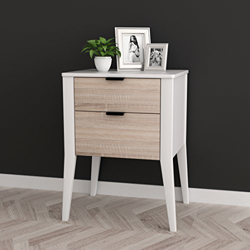 Product Description This White / Sonoma Oak Side End Table Nightstand with Two Storage Drawer is a great addition to your home decor. Features two drawer for storage. Measures: 26 inches high x 19 inches wide x 16 inches deep. Assembly required. 0