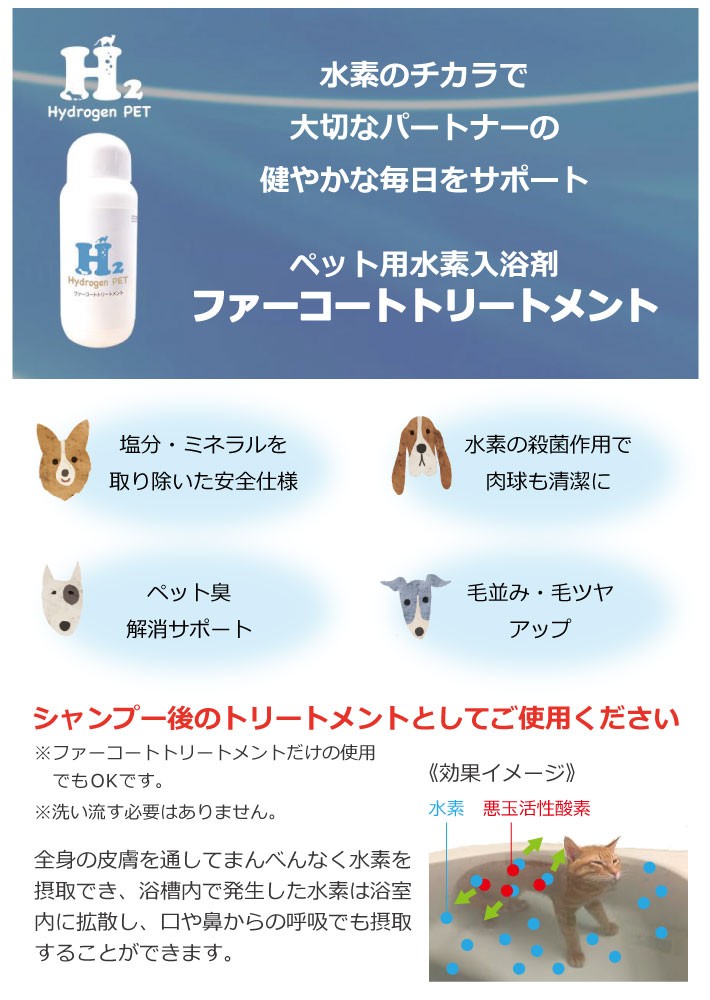 飲んでも舐めても安心。ペット用水素発生入浴料 3本セット H2 ファーコートトリートメント 200g ペット 犬 ドッグ トリミング お風呂 入浴剤 水素 ハイドロジェン シャンプー リンス 消臭 毛艶 送料無料
