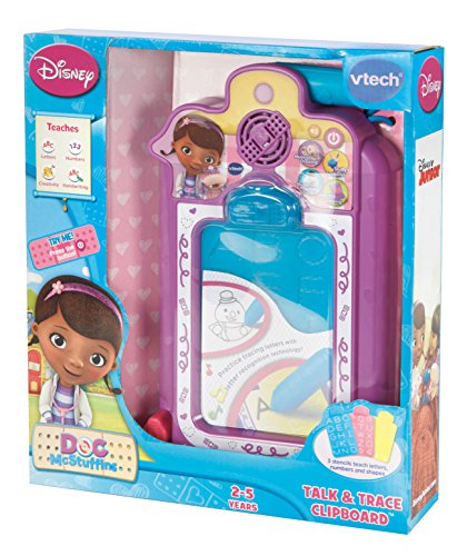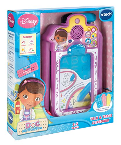 The Doc is in, so let's get learning with the Talk & Trace Clipboard by VTech and Disney. This electronic clipboard has 4 learning activities and 15 playful melodies. Three detachable stencils paired with our letter recognition technology teach letters, numbers, early writing skills and health topics. Plus, Doc McStuffins joins the learning fun by providing encouraging messages! Doc's Talk & Trace Clipboard is an electronic magnetic drawing board that has letter and number recognition technology featuring Doc McStuffins and her friends. Doc McStuffins guides your child through play and introduces them to letter names, numbers, vocabulary, shapes, health tips and more. Three detachable letter stencils help your child learn basic writing skills and to recognize their letters and numbers. Using the perfectly sized stylus the four drawing and writing activities promote imaginative and creative play while promoting strong hand/eye coordination. Character sounds and music respond to drawing action to keep your child engaged. Plays 30+ melodies and engaging sounds to enhance drawing and learning fun.