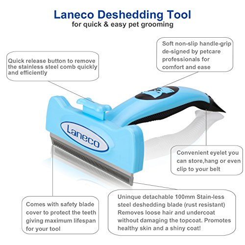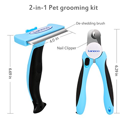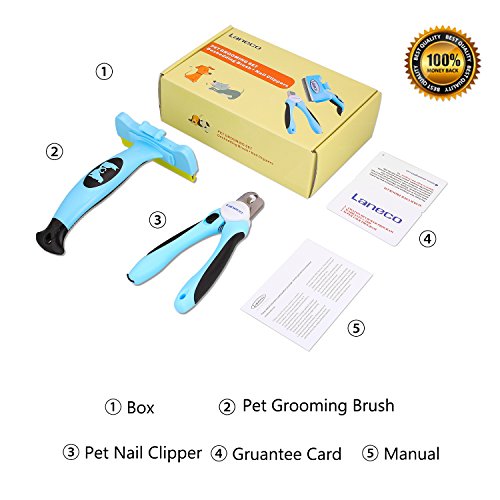 Nurture your creative side with these Laneco professional pet grooming tools. Grooming is proven to be healthy for dogs & cats! Daily grooming using our slicker brush & deshedding tool will allow you to see skin problems early on. Grooming will keep your cats or dog's coat shiny and smooth. Our deshedding tool will help to reduce allergies that can be caused by loose animal hair. You & your pet will be super comfortable! Our dog & cat hair brush is designed to snugly fit into your hand. You will love how easy it is to use! Your pet will love it. It has been designed to be as comfortable as possible on your pet's coat. Quick guard prevents overcutting! Our safety stop is designed to prevent you from overcutting your dog's nails. You know how important regular nail trimming is, it will stop ingrown nails or long curved nails that dig into your dog's sensitive toe pads, leading to discomfort. Lock the blades in place with the push of a button dog nail clippers large breed should always be kept away from children. As an extra precaution we have added a safety lock, which is located on the handle. Just slide up the lock button and the clippers will be locked in place. Package including – 1. 1 x pet deshedding brush. 2. 1 x pet nail clippers. 3. 1 x user manual. 4. 1 x guarantee card. Remove up to 95% of shedding fur from your cat or dog within minutes, so you don't have to worry about unsightly hair or fur all over your house, furniture or car. And you will be amazed at just how much loose hair has been removed. It gently removes the undercoat and other loose hairs, while detangling any matted fur. It helps your pets stay looking healthy and clean. It is powerful enough to trim your dogs or cats nails with just one cut, it will stay sharp for years to come for stress-free, smooth, quick and sharp cuts easy to lock blades allows for safe and convenient storage.Feature
