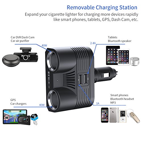 Convert your cigarette lighter to 2 sockets(Output: 2x40W) and 2 USB ports(1A+2.4A), for simultaneously use of 4 different electric devices.