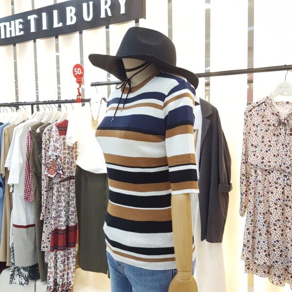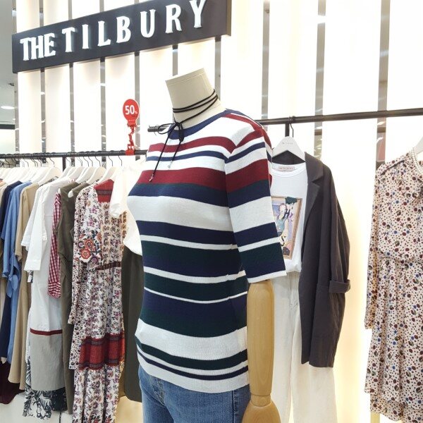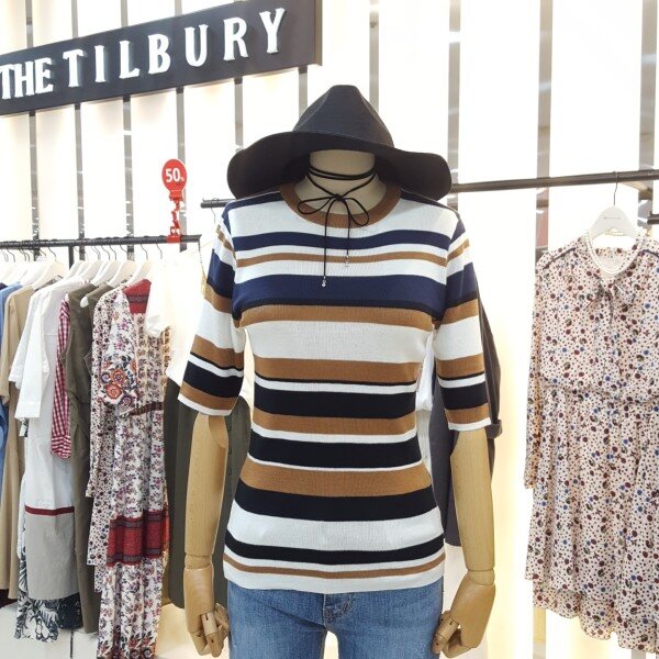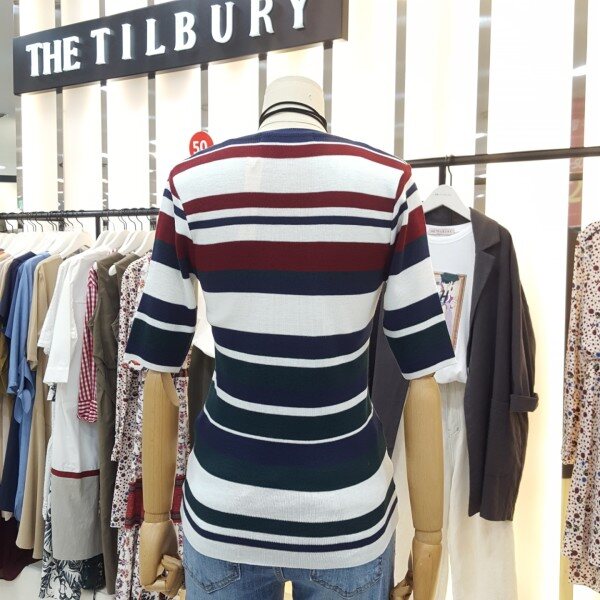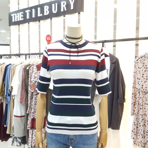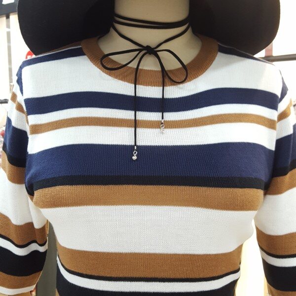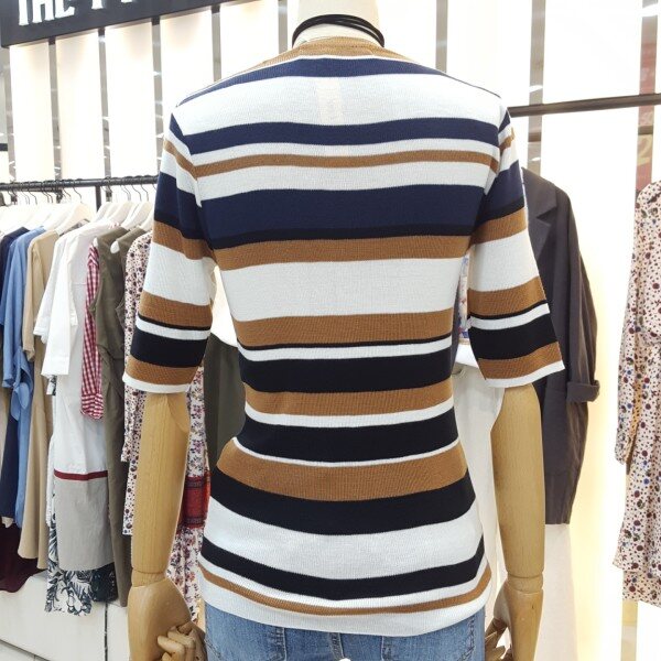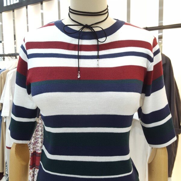 경쾌한 느낌의 삼색배색스트라이프 라운드니트아이템입니다.슬림한핏감과5부 소매단으로 포인트 이너웨어로 활용하기 좋습니다.