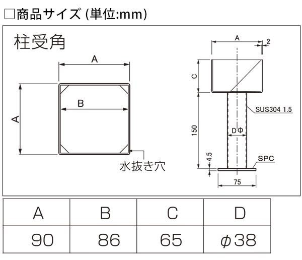 fk094igrjsステンレス柱受は、腐食に強いステンレス素材を採用し、柱そのものの腐敗を防止する4つの水抜き穴が施されています。 サイズ 個装サイズ:9×9×22cm 重量 個装重量:660g 素材・材質 本体:SUS304、ベース:スチール 仕様 耐荷重:500kg 研磨仕上 製造国 日本 腐食に強いステンレス素材を採用した柱受!! ステンレス柱受は、腐食に強いステンレス素材を採用し、柱そのものの腐敗を防止する4つの水抜き穴が施されています。