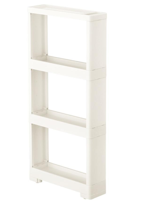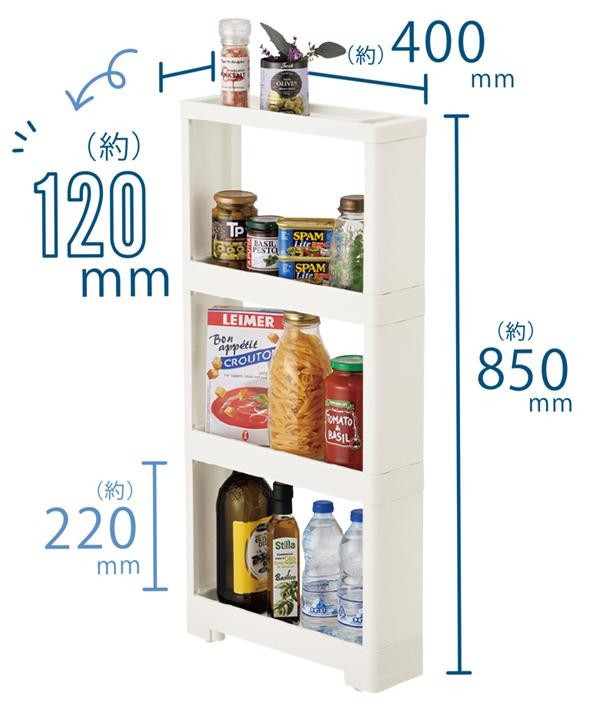 ちょっとした「スキマ」でもしっかり収納見た目もコンパクトで 幅はわずか12cmのスリムタイプキッチンや洗面所だけではなく お部屋のちょっとしたラックにも移動に便利なコロ付