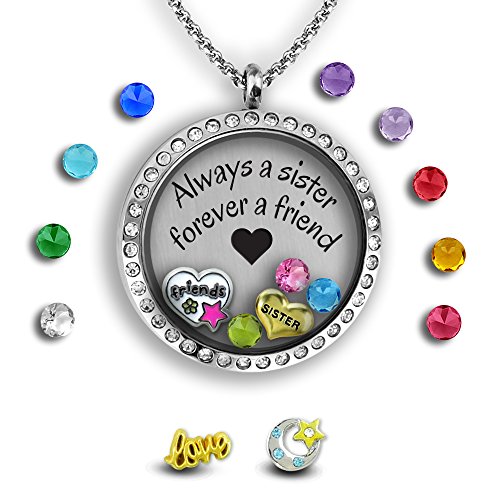 Giving the perfect gift to your sister to let her know every day how much you love her and what a fabulous best friend she is, is not so simple. You want her to feel loved and cherished every day. A personalized necklace, a floating locket necklace chock full of charms, birthstone crystals and our exclusive plate saying "Always a Sister, Forever a Friend" is the ideal gift for your precious daughter.