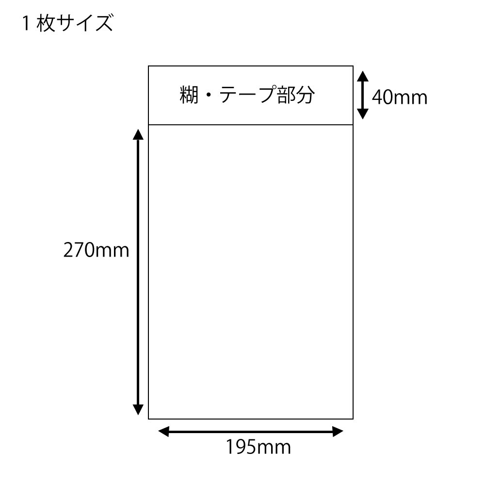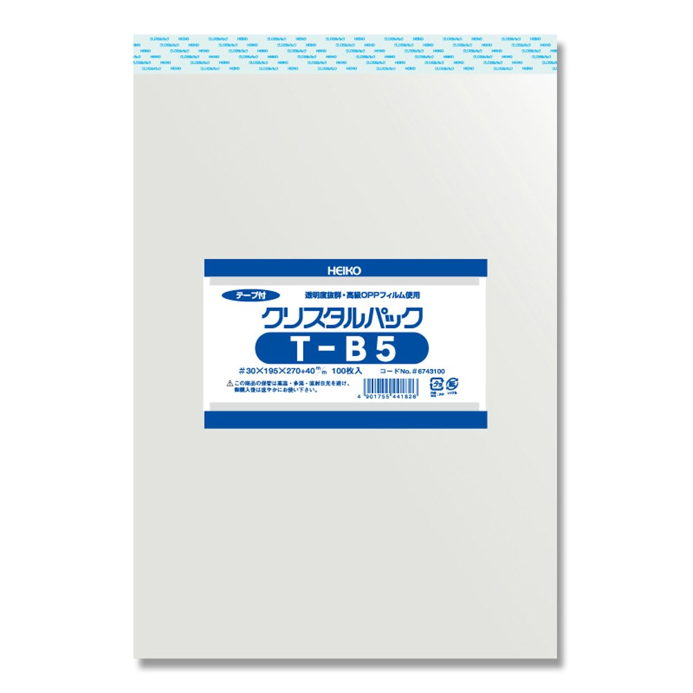 透明度と強度に優れたポリプロピレン製の「クリスタルパック」。 テープ付で封ができるタイプ。たっぷり使える大容量。 【サイズ】幅195×高さ270+テープ部分40mm 【入数】100枚 【材質】OPP0.03mm厚