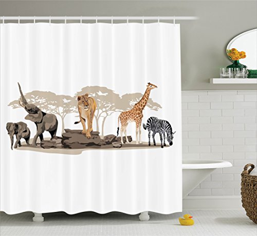 Ambesonne Safari Decor Collection, Illustration of Wild Savannahs African Animals Exotic Giraffe Lion Elephant Zebra Artprint, Polyester Fabric Bathroom Shower Curtain, 75 Inches Long, Multi