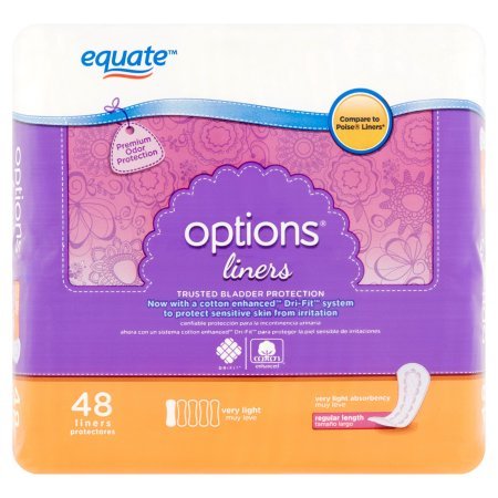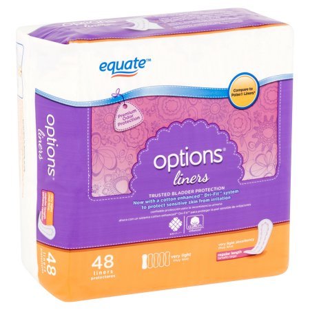 Studio : Equate Publisher : Equate Binding : Health and Beauty Product Description Very Light Absorbency Regular Length Liners Now with a cotton Enhanced Dri-Fit system to protect sensitive skin from irritation Dri-Lock Core quickly locks up moisture and odor. cotton enchanced Dri-Fit system wicks away moisture to help prevent skin irritation. Thin-Fit Design for soft comfortable protection. Individually wrapped for your convenience. -Thin-fit design for soft, comfortable protection -Individually wrapped for your convenience and discretion 0