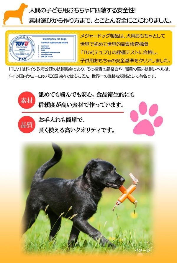 | 素材は耐久性が高く、ワンちゃんが噛んでも安心・安全なものを使用しています。ワンちゃんが長く楽しめるよう様々な工夫がなされているおもちゃです♪そのクオリティの高さは、ドッグトレーナーも愛用している程です! |