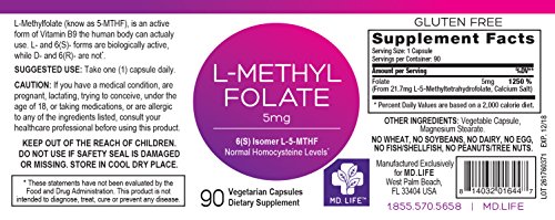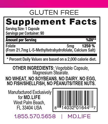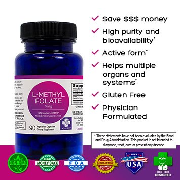 This bioactive folate is up to seven times more bioavailable than folic acid. This greater bioavailability is especially important in people who have a genetic enzyme deficiency since it requires no conversion to become metabolically active.