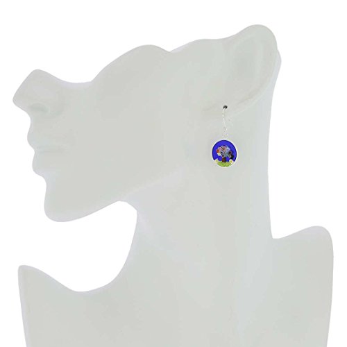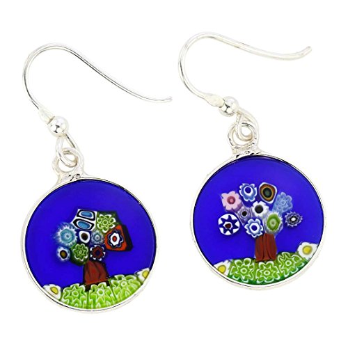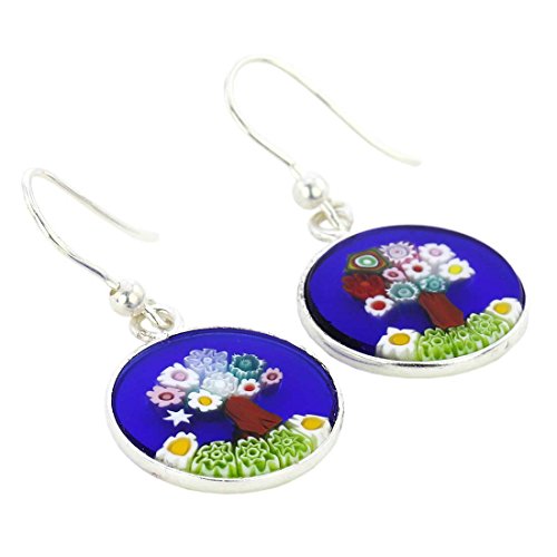 -. Title : Murano Glass Millefiori "Tree of Life" Round Dangle Earrings - Silver