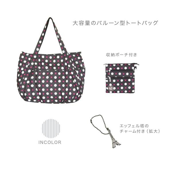| 肩掛けもできる、大容量のバルーン型のトートバッグ。バッグには内ポケット1つと外側に4つのポケットが付いています。本体のベルトを使えば、キャリーケースへの固定OK。旅行用はもちろん、普段使いにも便利。 |