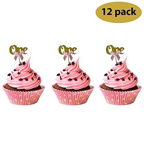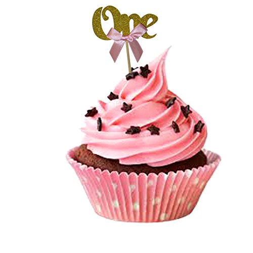 Product Description These glitter gold "ONE" cake toppers will beautify and enhance your baby's first birthday or first anniversary celebration immensely. They are made of excellent quality glitter oak tag paper, wrapped with a fine pink satin bow, and stuck onto strong quality wooden picks. 0