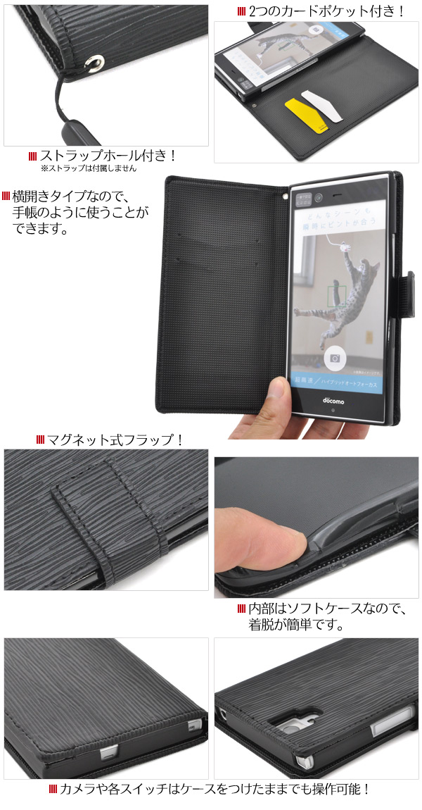 | 製品仕様 | | 対応機種 | arrows NX F-02H | | カラー | ブラック/ホワイト | | 素材 | PVCレザー/TPU | | 注意 | ※本製品はマグネットを使用しておりますのでクレジットカードなどの磁気カードの収納は避け、カードの注意事項をよくご確認の上ご使用ください。 読み取り等ができなくなる恐れがあります。 ※本製品に収納された、カードのデータ等が喪失された場合におきましても、 当社では一切保証致しかねます。 ※長時間接触していたり、強い力で擦れるとスマートフォンに色移りする場合がございます。 ※本製品をスマートフォンに装着する際には本体や本製品に付着したゴミやホコリをよく取り除いてください。 ホコリ等がついたまま装着すると、スマートフォンに傷がつく恐れがあります。 ※ 本製品は強い衝撃からスマートフォンを保護することは出来ません。 |