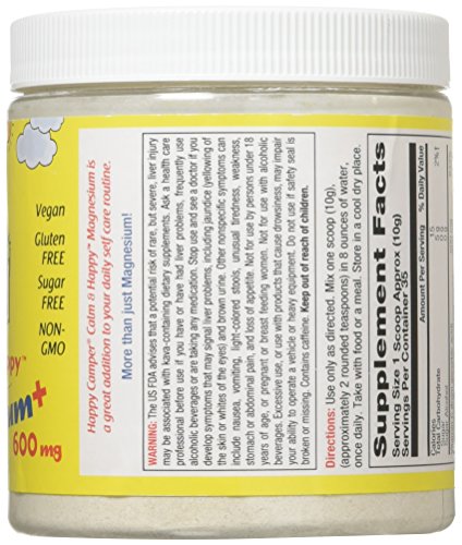 Happy Camper Calm Happy Magnesium Lemon by Natural Balance 350 gram Powder Happy Camper Calm Happy Magnesium Lemon 350 gram Powder Suggested Use As a dietary supplement Use only as directed. Mix one scoop (10g) (approximately 2 rounded teaspoons) in 8 ounces of water once daily. Take with food or a meal. - Or as directed by your healthcare professional. Supplement Facts Serving Size 1 Scoop Approx (10g) Servings Per Container 50 Amount Per Serving Daily Value Calories 15 Total Carbohydrates 5g 2 Sugars 0g Sugars Alcohol 0g Vitamin C 500mg 633 Magnesium 600mg 150 Sodium 100mg 4 Calm Happy Blend Eleuthero (Eleutherococcus senticosus) (root) Gotu Kola (Centella asiatica) (leaf extract) (41) Kava (Piper methysticum) (root) Kola Nut (Cola nitida) (seed extract) English Lavender (Lavendula angustifolia) (flower) Passionflower (Passiflora incarnata) (flowering tops extract) Schisandra (Schisandra chinensis) (berry) Wood Betony (Stachys officinalis) (aerial) 880mg Daily Value Not Established.Feature