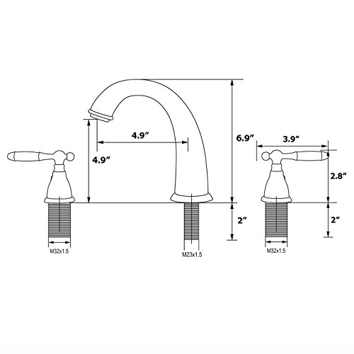 Overall height:6.9"; Spout Height:4.9"; Spout Reach:4.9". Three hole widespread installation.
