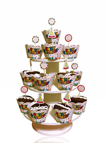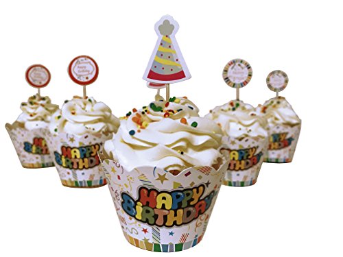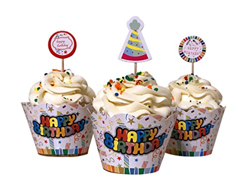 • 12 Happy Birthday themed cupcake wrappers. Perfect design for a Birthday party especially for school birthday parties. Perfect for both adult events and parties for kids. • Perfect size for standard homemade and store bought cupcakes. Assemble in seconds by sliding the tab into a slot. Mount toothpicks on the small picks insert into the cupcake frosting.These are bottomless wraps, not cups.