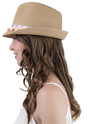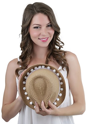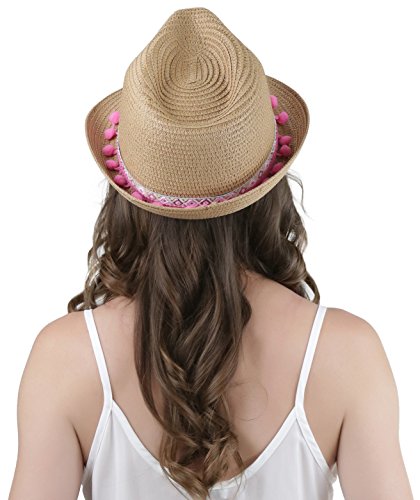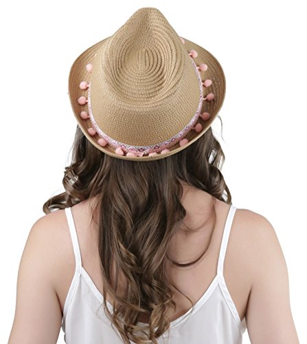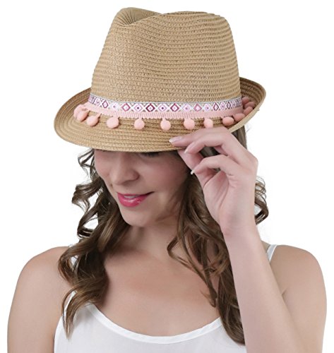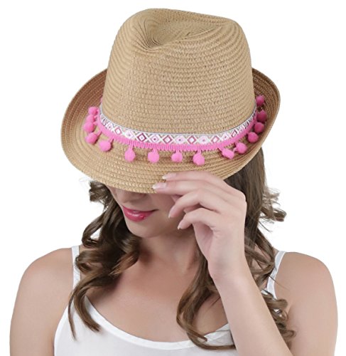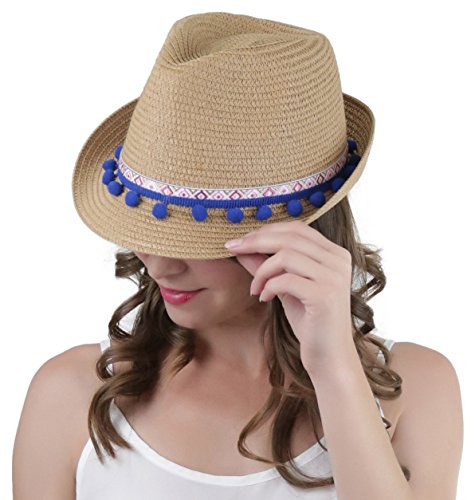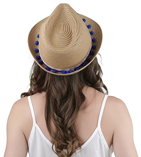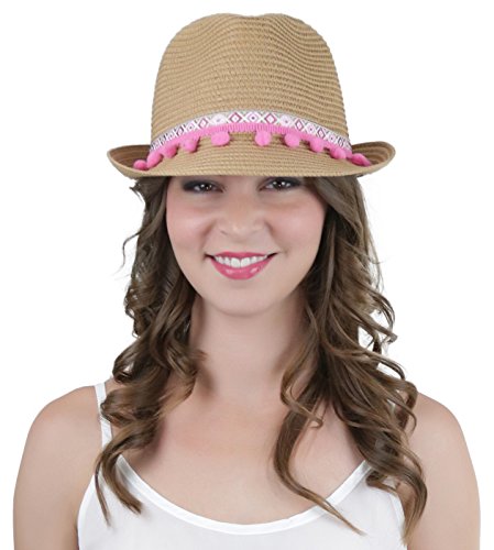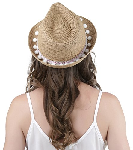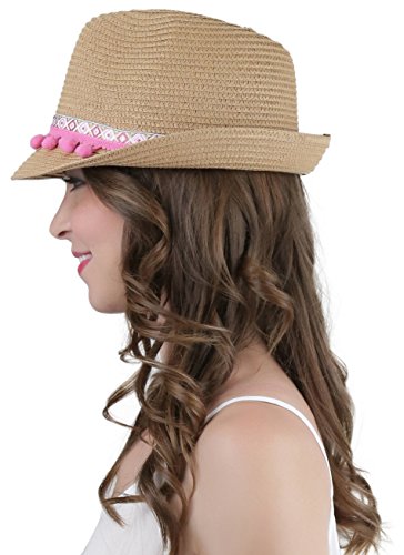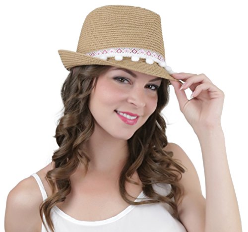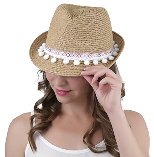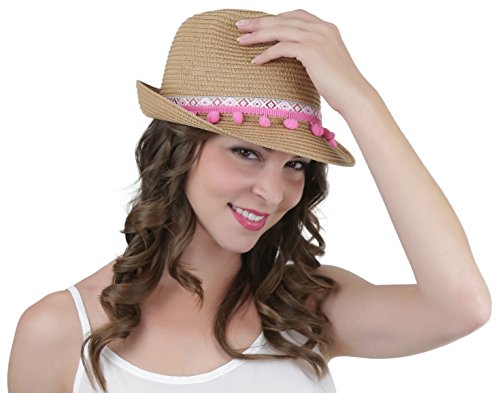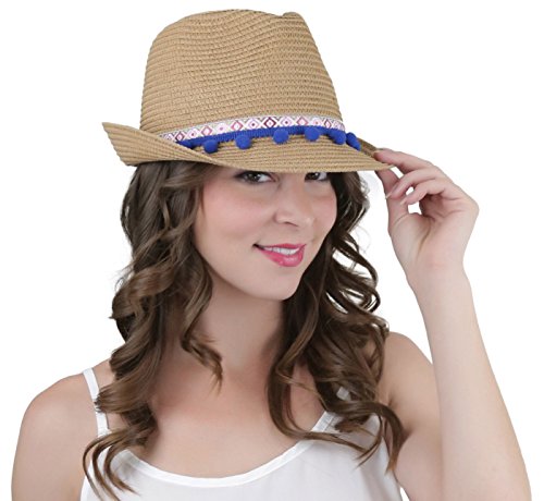 ToBeInStyle Women's Diamond Tribal Ribbon Cotton Ball Peaked Brim Khaki Fedora